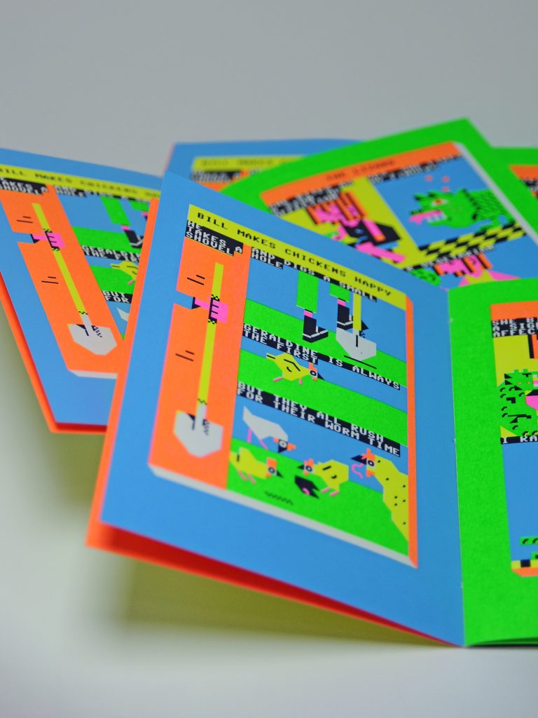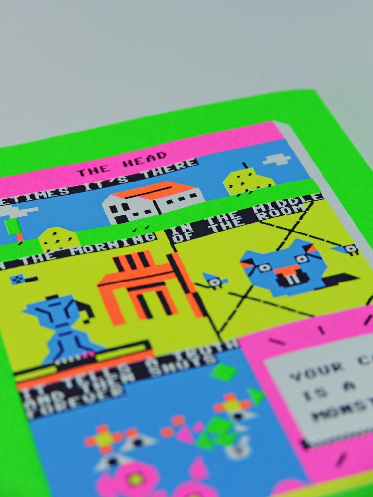 200 screenprinted numbered copies, 16 pages, 15x21cm, 4 neon colors + black, stitch handbinding,